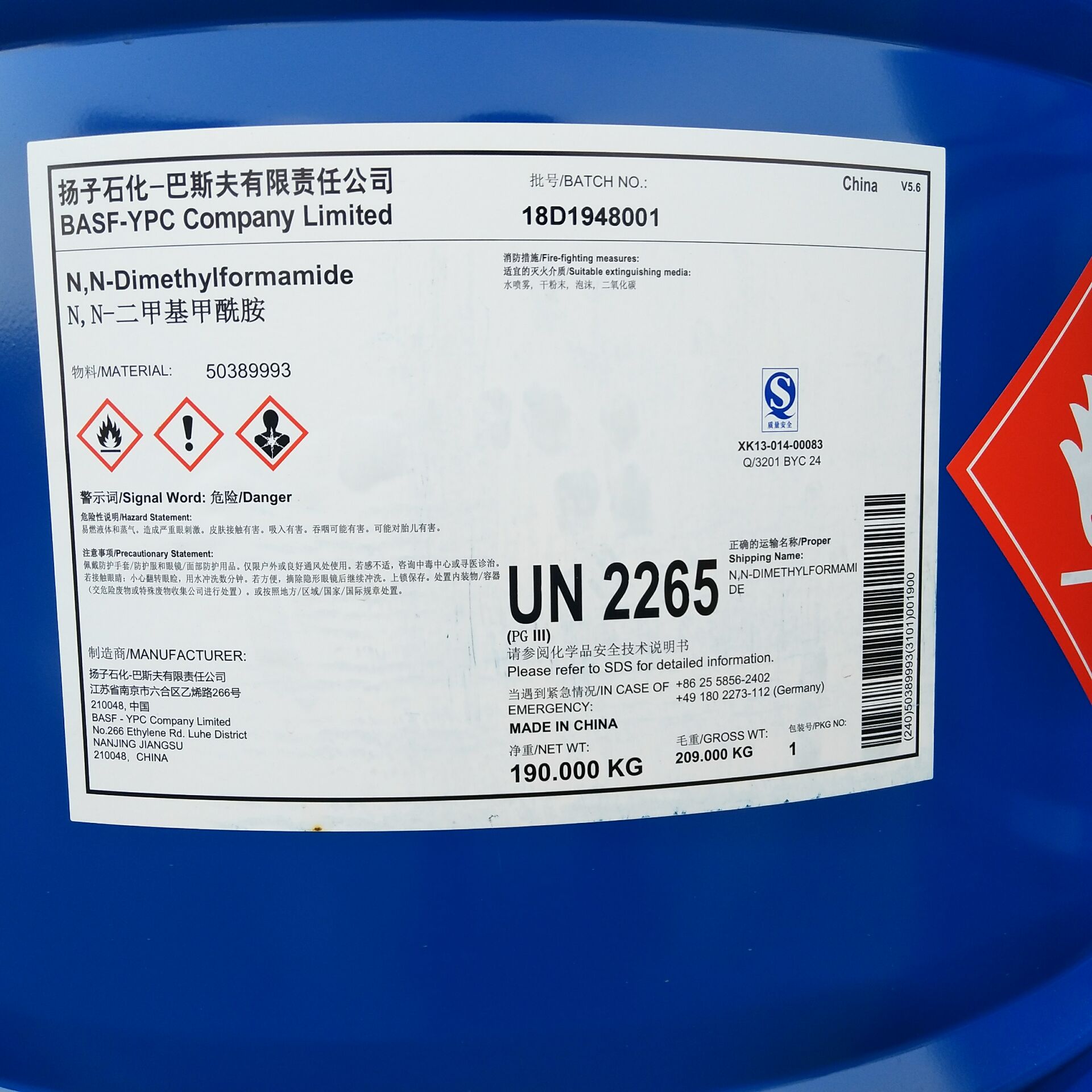 產(chǎn)品名 | N,N-二甲基甲酰胺 | 英文名 | N,N-Dimethylformamide(DMF) | 產(chǎn)品外觀 | 無色透明液體 | 包裝規(guī)格 | 190kg/桶(鐵桶) | 產(chǎn)地 | 江蘇南京 | 供應(yīng)商 | 揚(yáng)子巴斯夫 | 應(yīng)用 | 用作分析試劑和乙烯樹脂、乙炔的溶劑等 | 危險(xiǎn)類別 | 3類; | CAS NO | 68-12-2 |